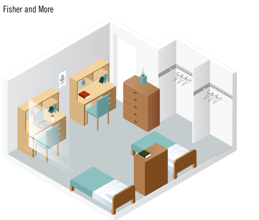 3. Bed-over-desk Double Rooms - Each student in a bed-over-desk double is provided with their own closet, bed, desk and desk chair. These rooms are only located in Wilson Hall (Bed-over-desk双人间:上层床、下层书桌、椅子、橱柜,此类房型只在Wilson Hall)