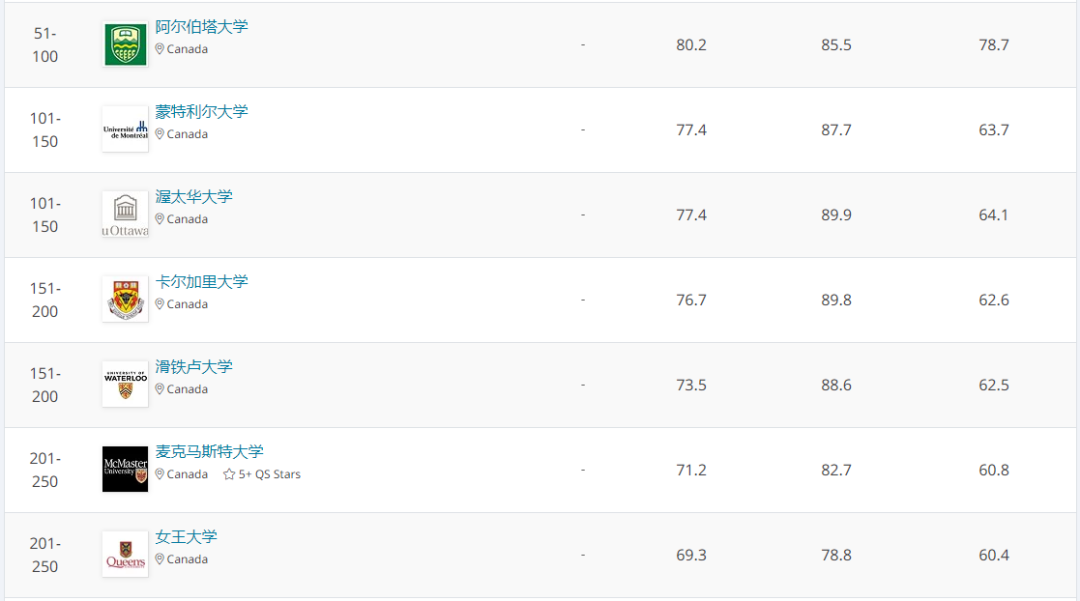 2020 QS世界大学化学专业排名(加拿大大学部分节选)