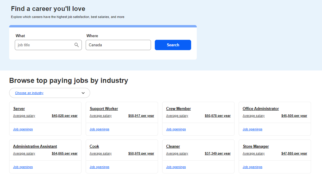 除了看参照各省时薪,YOLO学姐推荐大家可以到Indeed, PayScale 这类求职网站查询一下各个职位、各个行业的大概年薪。这样在找工作的初期能够比较全面的做对比,在留学专业和对后期的职位规划也能找到明确的方向。