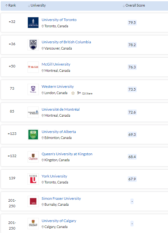 【2022 QS世界大学商业与管理研究类专业排名中加拿大大学部分节选】