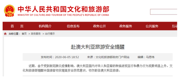 而早在6月5日的时候,文化和旅游部政府门户网站就发布了《赴澳大利亚旅游安全提醒》: