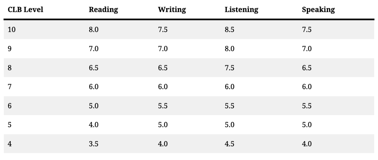 诸如下图,是加拿大移民 G 类雅思对应的 CLB 水平: